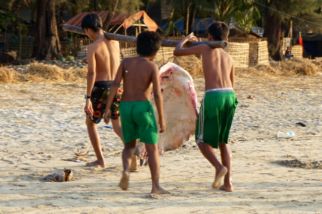 Yesterday we mixed it up a bit and visited the closest fishing village, Jade Taw, in the afternoon instead of the morning. All the tarps of dried fish were already picked up and most of the fishing boats were out to sea on the afternoon run. We did happen upon some boys carrying the biggest ray we’ve ever seen from the shore to the village.