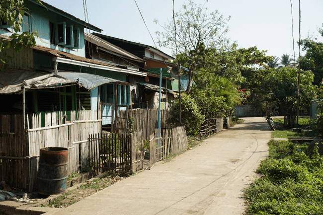 The community across the river is part of Yangon city, but is a township called Dahla. The scene at the ferry dock on that side is crazy, with people coming and going in every direction, trishaw drivers and scooter “taxis” shouting for customers, and mini-van bus drivers shouting destinaions through bullhorns. But once you wade through the crowd the scene quickly becomes more rural, with a combination of paved and dirt roads and houses built from bamboo mats and other found materials lining the streets on both sides.