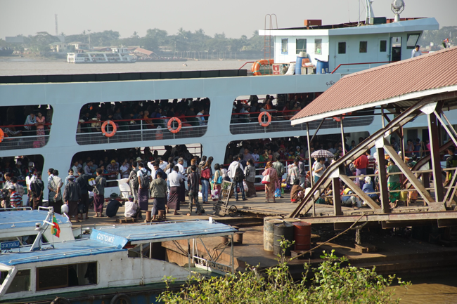 The current here is very strong, so to cross the ferry essentially drives sideways. It’s about a 15-minute ride, and the boats go back and forth all day long. Locals pay 100 kyats (about $0.10) each way. On the way over, we rode in front of the captain up there on top, which we had to ourselves and enjoyed a nice breeze as we made our way to the other side.