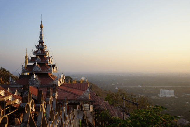 Due to our late arrival, we managed to squeeze just one sight in on this day: Mandalay Hill. It’s a religious site with a number of pagodas and VERY popular with tourists and localsat sunset. Mandalay is incredibly smoggy (due, we think, to a number of factors: dust, diesel exhaust, and agricultural burning) so the view from the hill is actually not that great. So that, combined with the swarm of tourists, made for fairly medocre photographic conditions. This was the best I could do.