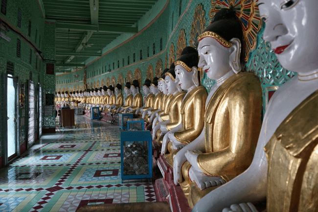 The highight of Sagaing is Umin Thounzeh, a crescent-shaped temple featuring a row of 45 Buddha images.
