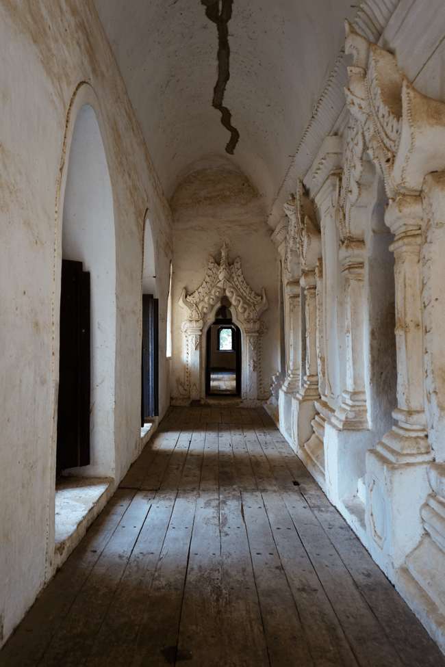 Our next stop was an old brick and stucco monastery, which is unusual as they are almost all built from wood. Myo explained that structures were built from wood on this site twice and burned down twice, so the queen in charge finally broke tradition and commissioned a more fire-resistant structure. I found this to be one of my favorite sites; we arrived before the bulk of the other tourists and the mix of yellow walls and black soot combined with the ornate carving details was quite beautiful.