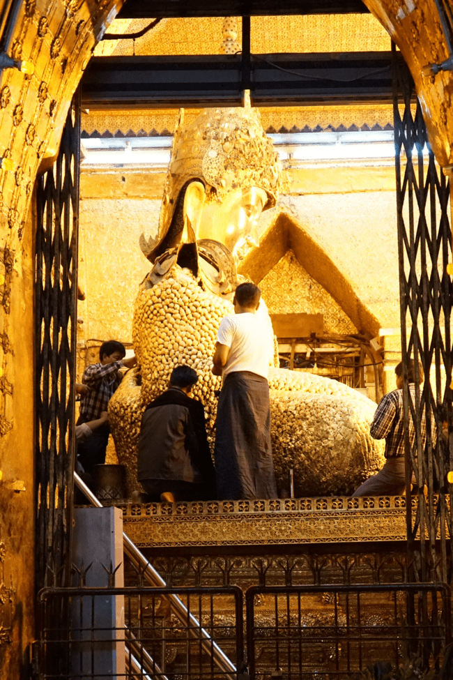 visited a Buddha that people add small bits of gold leaf onto to honor relatives and hope for good fortune (correction: men add bits of gold leaf, as women are forbidden to do so. A leftover Hindu tradition, as, according to Myo, Buddhism does not discriminate based on gender),