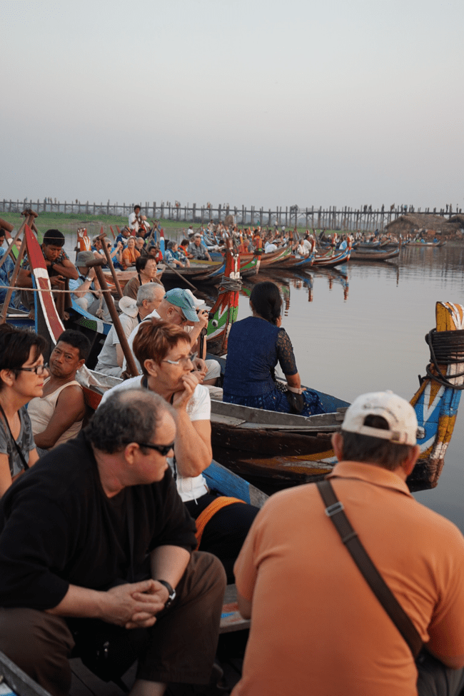 The day concluded with what was, up to this point, the most touristy attraction we’d done so far: sunset at U Bein’s Bridge. The world’s longest teak footbridge, it extends 1,300 yards across Taungthaman Lake, which at this time of year (dry) is pretty low, so the brige actually crosses a lot of seasonal farmer’s fields. We arrived at the parking lot a little on the early side, so elected to sit at one of the cafes for a soda and rest. This was where, for the very first time in Myanmar, we encountered begging. I’d so far marveled at the absense ot if here, as I get panhandled in San Francisco (and downtown San Rafael) on a daily basis. Seems to me that people here have to feel extraordinarily desperate to resort to straight-up asking for money in return for no work performed. Usually you’ll encounter people at least making an attempt to provide some kind of service in exchange for money: cleaining up a section of stairs at a pagoda (and asking for “donations for cleaning,”) or sweeping the sand off a stretch of road in the hopes that tour buses will open their windows and toss out some candy and a few kyats as they pass. The begging was upsetting; it breaks your heart to have a bent-over old woman stand beneath your cafe chair and repeat, “Money, money, money, money…” You feel rude for ingnoring her, but also know the perils of engaging, even with eye contact. For me it cast a dark pall on this particular experience.